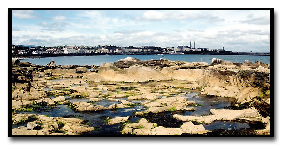 Dun Loaghaire vanaf die "Forty Foot Bathing Pool" - die tradisionele swemarea vir kaal ouer mans!
