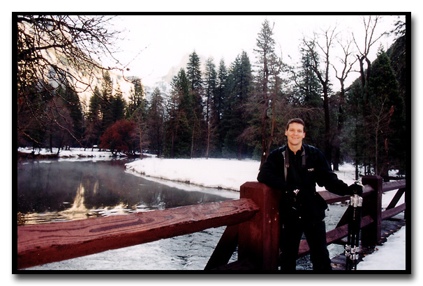 Nicol op een van die talle bruggies oor die Merced Rivier op ons laaste oggend in Yosemite.